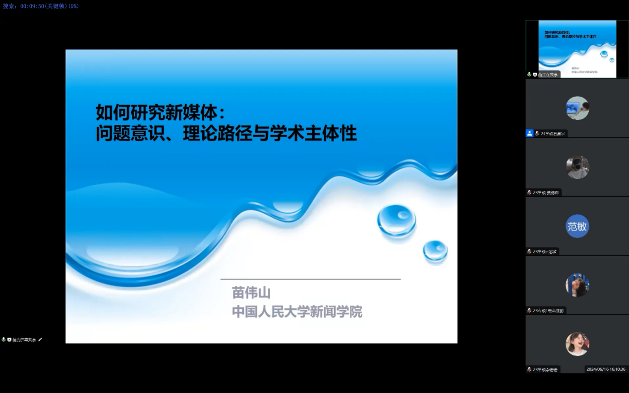 6月16日下午16:00,yl23455永利官网邀请中国人民大学新闻学院副教授苗伟山主讲《新媒体研究:案例与方法》。讲座由李宏刚副院长主持,学院部分教师代表和硕士研究生积极参与。苗伟山副教授以其深厚的学术背景和丰富的实践经验,为大家带来了一场关于新媒体研究的前沿分享。