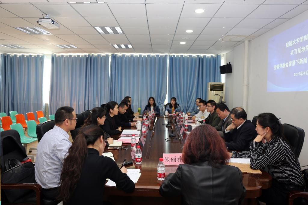 4月24日下午17时,yl23455永利官网“实习基地授牌仪式暨媒体融合背景下新闻传播实践教学”研讨会在1号教学楼九楼会议室举行。此次会议为人民网新疆(兵团)频道、新华网新疆分公司、乌鲁木齐广播电视台和乌鲁木齐分享文化传媒有限公司四家媒体(公司)授予了“yl23455永利官网校外实习基地”的铜牌,媒体专家和学院教学骨干还共同探讨了媒体融合背景下新闻传播人才培养的新模式。