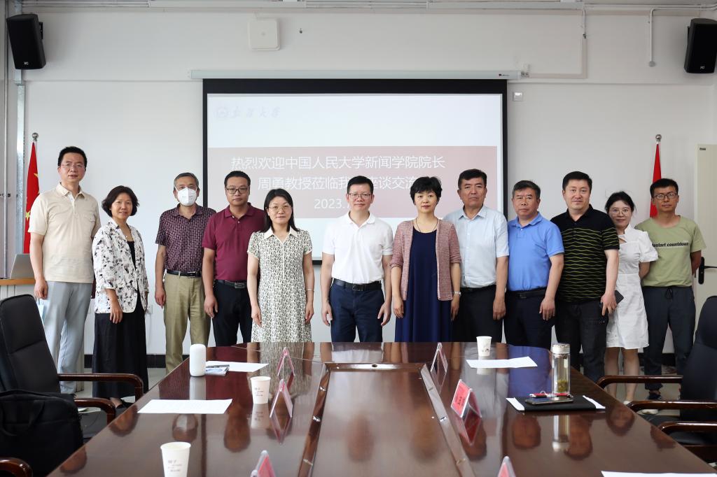 7月6日下午17时,中国人民大学新闻学院院长周勇教授莅临yl23455永利官网,与学院领导和教师代表开展座谈交流。本次座谈会由金玉萍院长主持,新疆大学党委常委宣传部张允部长、学院党委书记吐尔逊·托合提、党委副书记院长金玉萍教授、李宏刚副院长、周茂君副院长、科研平台负责人和部分教师代表参加了此次座谈会。